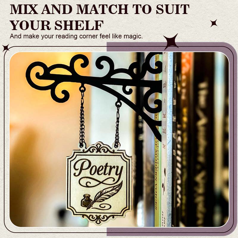Trå inn i en verden hvor hver sjanger har sin egen koselige krok 🍷✨. Inspirert av klassiske pub- og butikkskilt, gir disse fantasifulle bokskilleveggene et snev av mystikk, eleganse og fortellerens magi til hjemmets bibliotek. De er mer enn bare organisasjonsverktøy; de forvandler bokhyllen din til et sted du vil elske å utforske – akkurat som en liten favorittbokhandel.