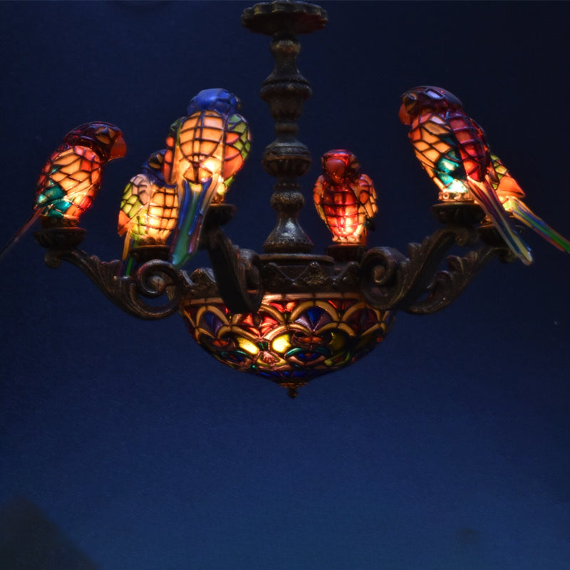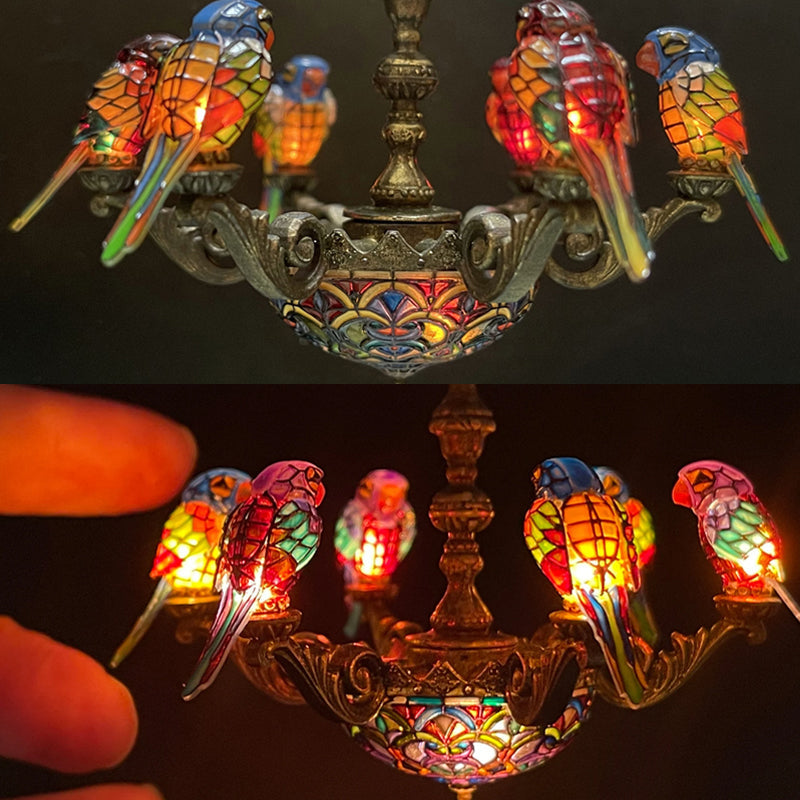 Hver fugl er laget av håndskåret farget glass og lyser i levende farger som forvandler ethvert rom til en tropisk drøm. -